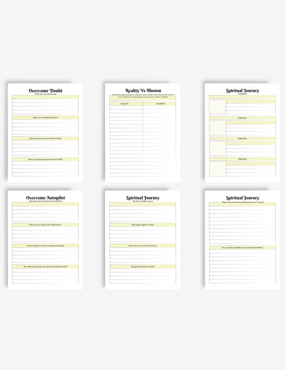 1 pdf of 28 pages. Journals, questions, habit trackers, calendar, mood trackers, self care activities, overcome autopilot, timeline notes, reality vs illusion, Overcoming doubt, witnessing the ego, letting go of negative emotions, gratitude and many many more.